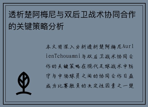 本文将深入分析透析楚阿梅尼(Aurélien Tchouaméni)与双后卫战术协同合作的关键策略。在现代足球战术中,防守与中场球员之间的协同合作日益成为比赛胜负的决定性因素之一。楚阿梅尼作为一名优秀的防守型中场,他与双后卫体系的协同运作展现了独特的战术价值。通过分析楚阿梅尼在防守体系中的作用、双后卫战术的运作方式、两者的配合以及如何共同影响比赛节奏等方面,本文将揭示楚阿梅尼与双后卫战术协同合作的核心要素及其在比赛中的实际效果。最终,文章将总结这些战术合作对于现代足球的影响,以及它们如何为球队提供更多的战术灵活性。